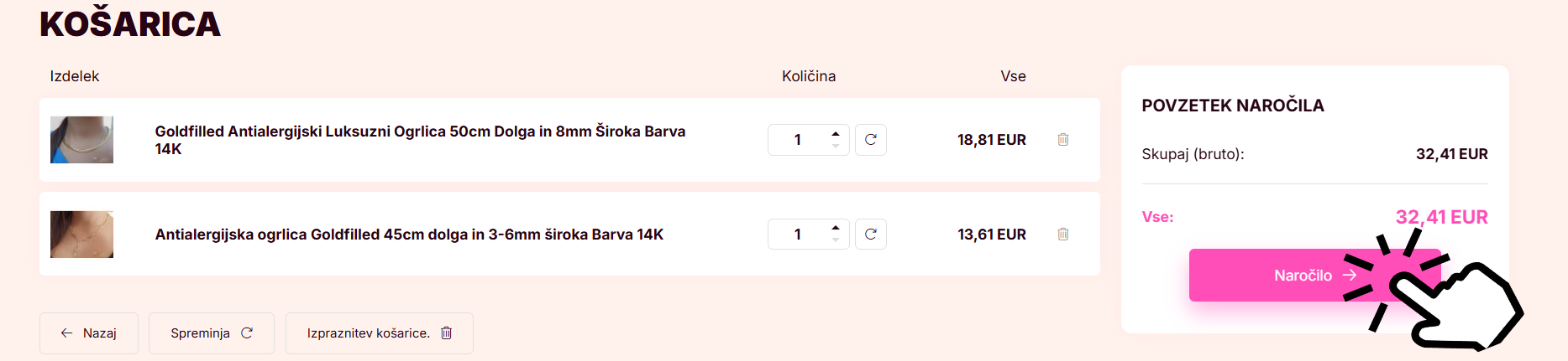 4. NA STRANI KOŠARICE KLIKNITE NA GUMB ZA NAROČANJE ZA NADALJEVANJE NAROČILA.