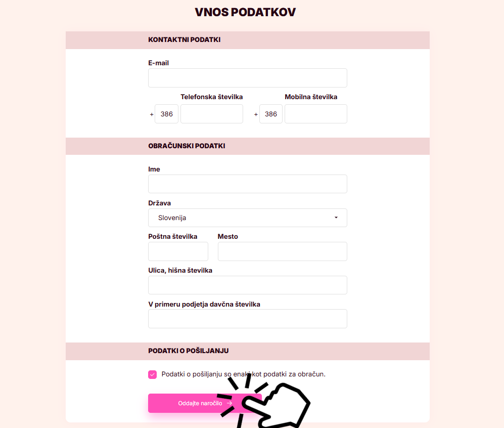 3. ZA NADALJEVANJE ODDAJE NAROČILA KLIKNITE NA ROZA GUMB.