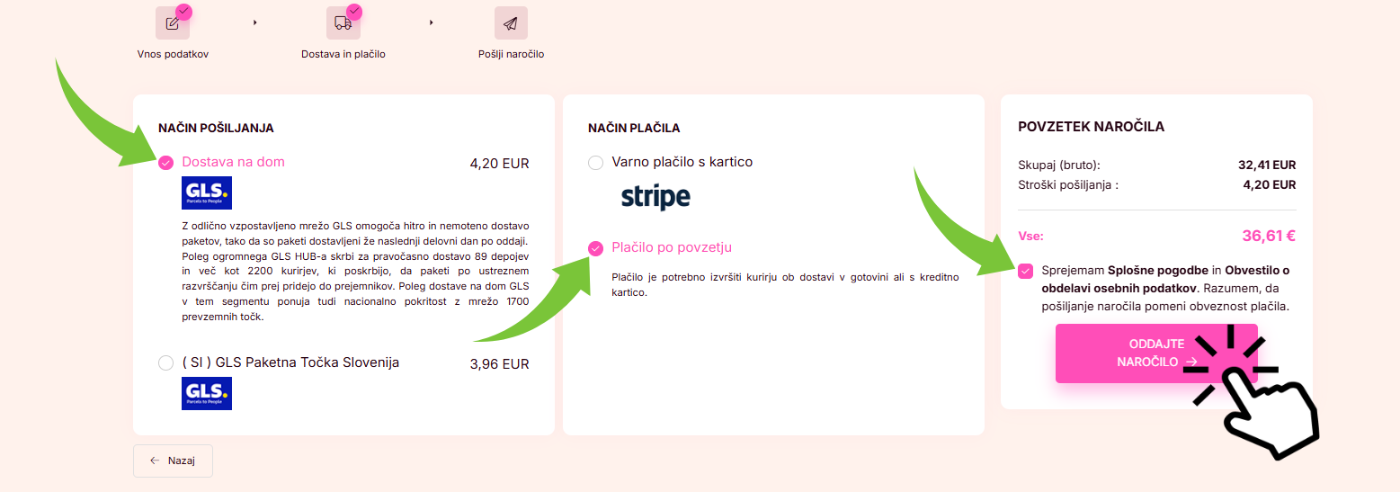 6. IZBERITE NAČIN DOSTAVE IN PLAČILA, SPREJMITE POGOJE POSLOVANJA TER KLIKNITE SPODAJ NA GUMB ZA NAROČILO.